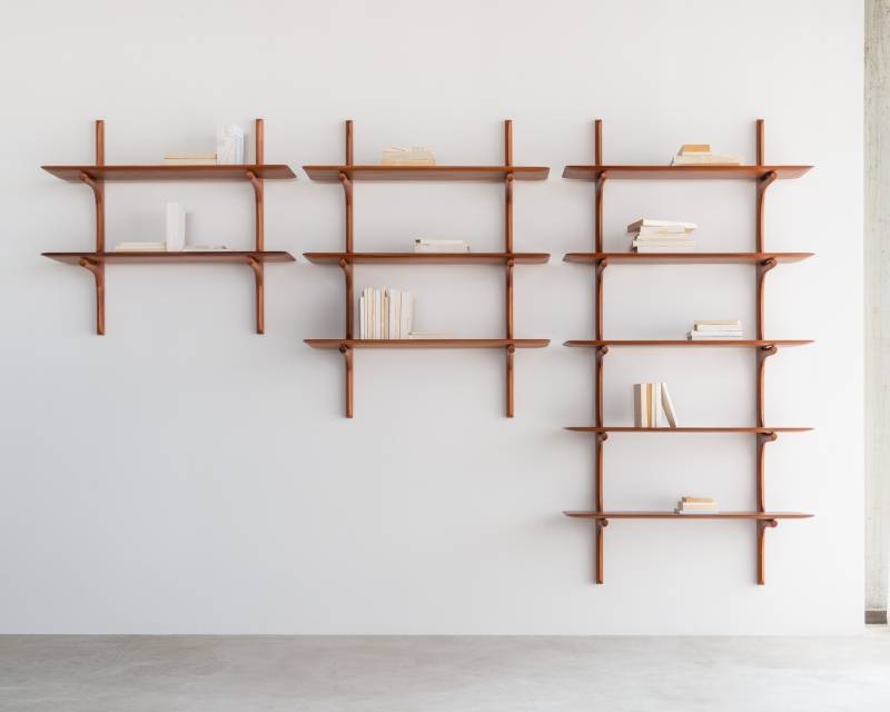 Les étagères Pi de déclinent en deux, trois ou cinq étagères et dans trois coloris de bois. Le chêne naturel clair, l'acajou naturel et l'acajou brun foncé.