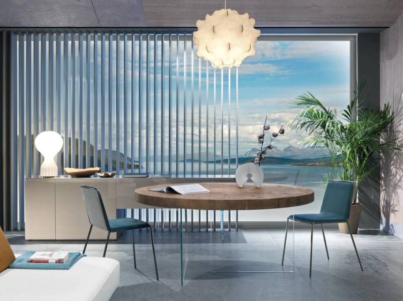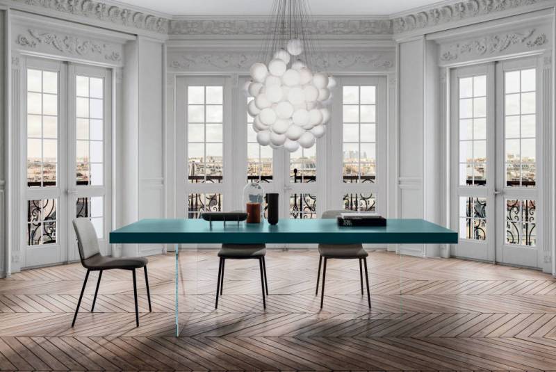 Daniele Lago a réussit à inverser les volumes. Le piétement disparaît pour mettre en lumière le plateau de la table qui paraît en gravitation dans votre salle à manger.