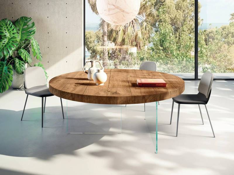 Le piétement se décline en verre extra clair ou fumé, le plateau est disponible dans plusieurs finitions chêne Wildwood, verre, Xglass.