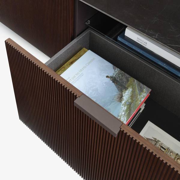 SELVANS c’est l’expression d’un meuble de rangement minimaliste avec l’utilisation d’un placage massif noyer rainuré. Le designer Christian Werner poursuit sa collaboration avec la marque Cinna en proposant une façade en noyer signature par le travail de précision sur l’extérieur. Des creux de 4mm, des largeurs de 4mm et une profondeur de rainurage de 3.5mm environ.