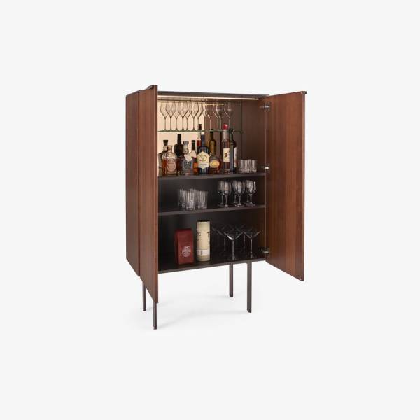 Le piétement tout en légèreté et le top en céramique viennent surligner les façades en noyer du buffet. Les plateaux en céramiques existent en finition : grés cérame aspect marbre blanc, grés cérame marquina, ou grés cérame emperador.