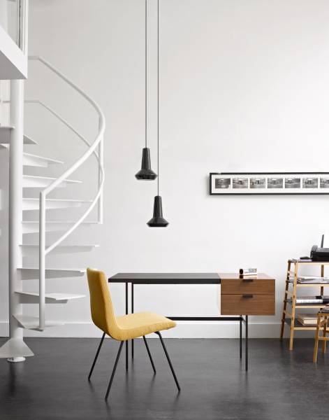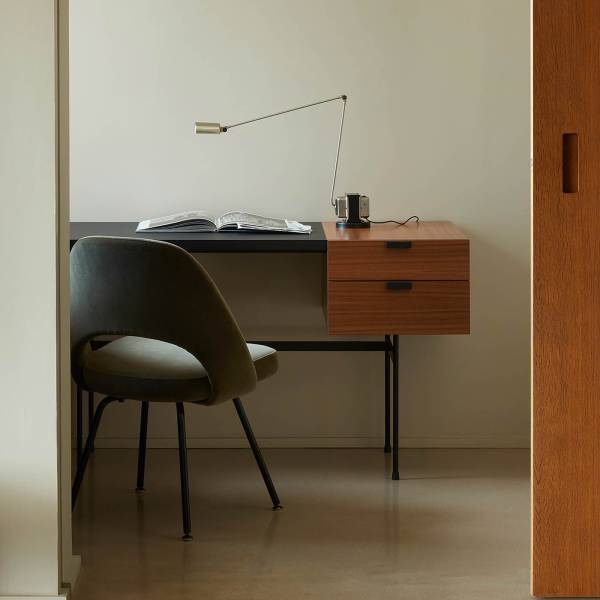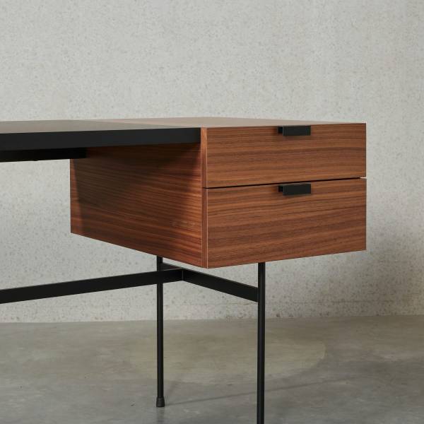 Le bureau minimaliste TANIS se compose d’un écritoire en fenix noir, un caisson de 2 tiroirs en noyer massif, et un piétement tubulaire noir mat. Typique de la période après guerre.