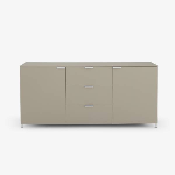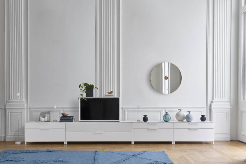 Dans la pièce à vivre, la collection propose deux types de bahuts, bas avec des portes ou haut avec 2 portes et 3 tiroirs au centre. Deux meubles type armoires sur pieds métalliques très hauts pour un look très contemporain, des bibliothèques avec ou sans meuble de rangement suspendu et des meubles TV avec tiroir et la possibilité d'intégrer votre barre de son.