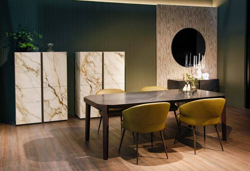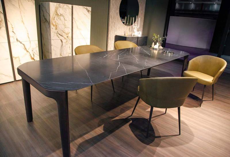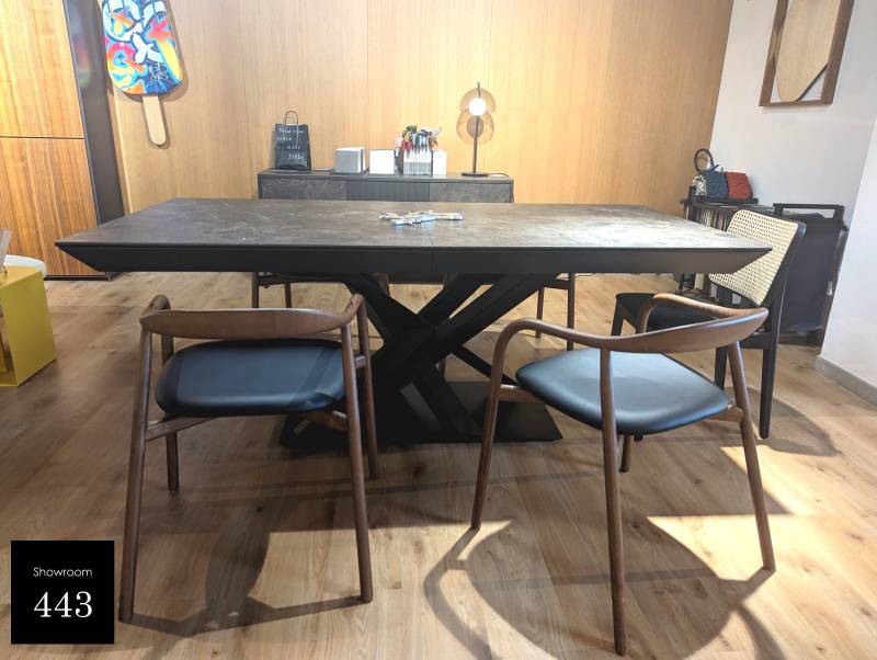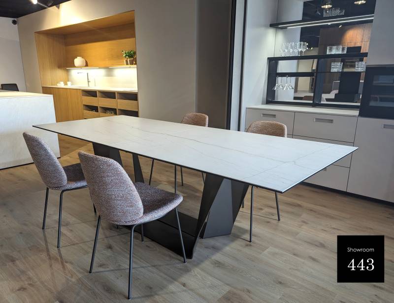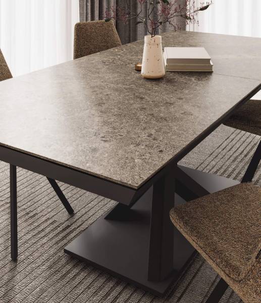 Le coup de cœur 2024 de Showroom443: La table de salle à manger extensible avec rallonge Plec dont le plateau est en céramique pour une facilité d'entretien et une durabilité exceptionnelle et le piétement central en tôle d'acier plier de 8mm, robuste et élégant. Le système d'ouverture centrale synchronisée permet une utilisation simple et harmonieuse sans déplacement des pieds.
