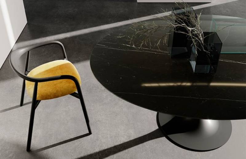 Le plateau en céramique Calacatta avec un piétement blanc apporte à la table Flûte un visuel très contemporain avec une touche années 70.