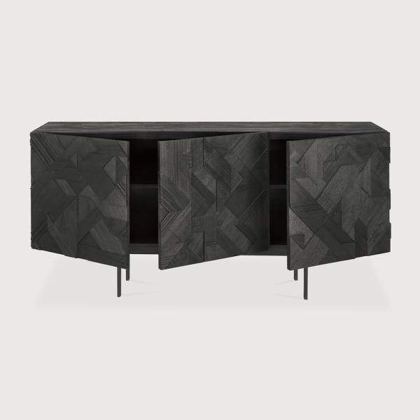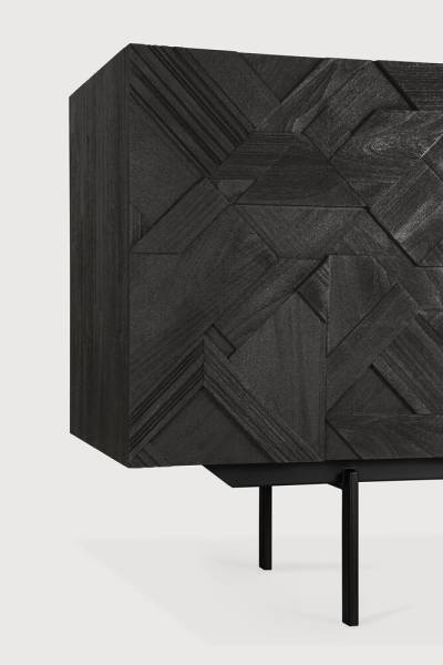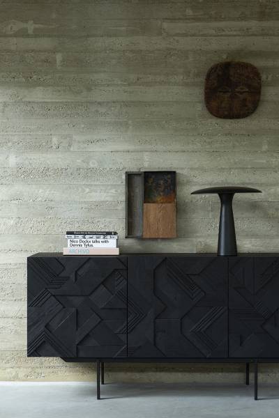 La marque collabore avec des designers de différents styles mais qui mettent toujours en valeur l'artisanat du bois. Le bahut de rangement en bois GRAPHIC est dessinée par le designer Alain Van Havre, Les façades sont une superposition de couches qui laisse apparaître un motif graphique dans la profondeur.