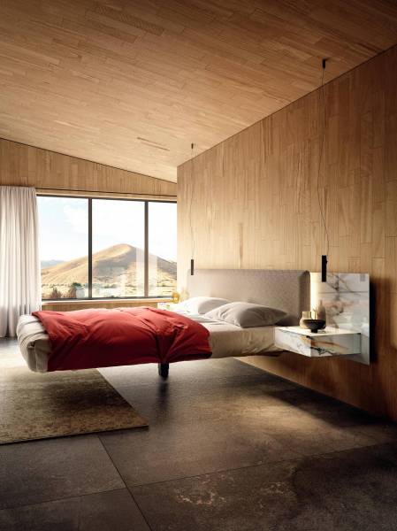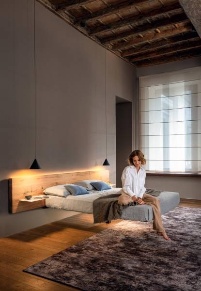 Le lit semble en apesanteur dans la pièce grâce au piètement en verre trempé ou piètement en métal central pour le modèle Fluttua et steel. La tête de lit peut être prévue au sol ou fixée directement au lit, en bois wildwood, tissus ou mélange des deux. Les chevets sont intégrés dans la tête de lit et peuvent être fixés en hauteur pour un effet suspendu. Les chevets intégrés se présentent sous formes d'étagères ou de tiroir, en bois, en verre ou en revêtement xglass.