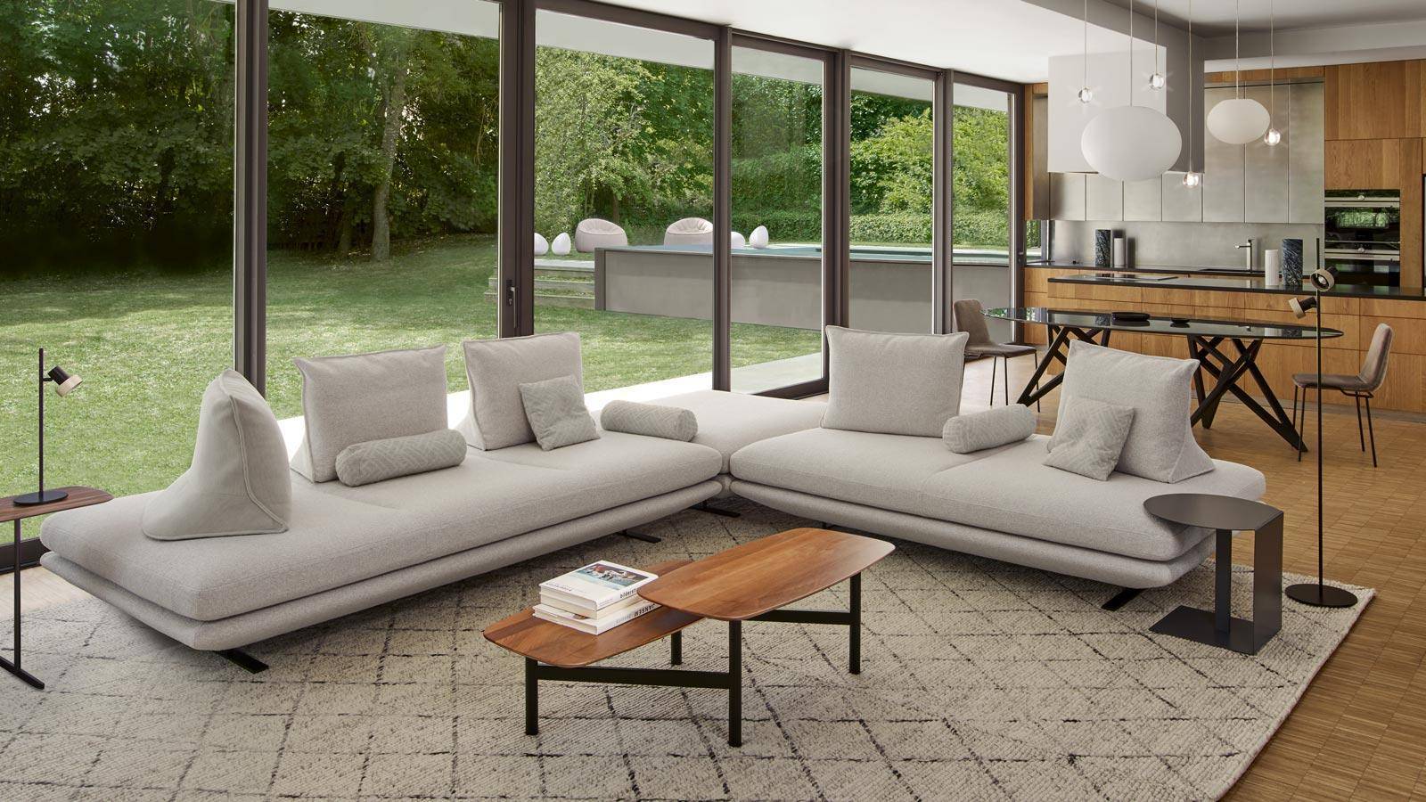 Manuel notre décorateur d'intérieur crée une ambiance moderne et légère grâce au canapé Prado d'un côté, les coussins de dossiers sont dissociables et permettent de personnaliser la profondeur de l'assise selon votre taille.