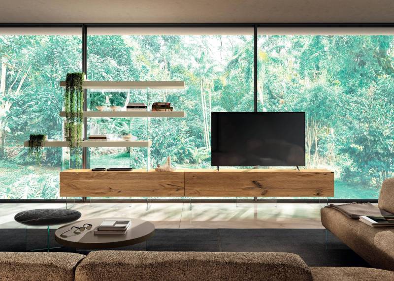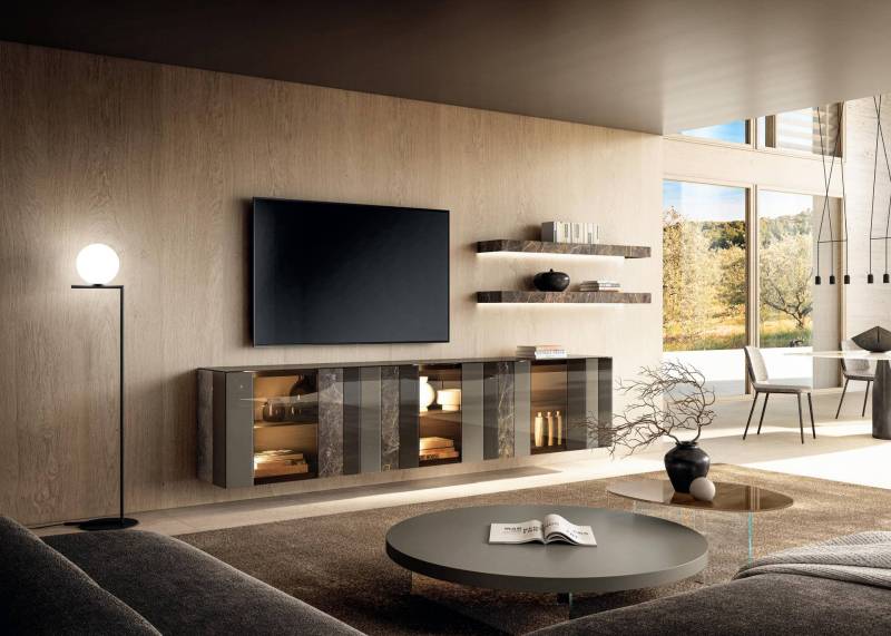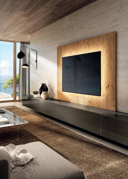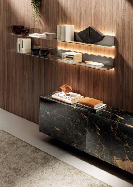 Avec des matériaux haut de gamme et incomparables, Lago proposent des design singuliers, propre à son univers. Du bois ancien vient accompagner les façades XGlass veinées ultra modernes et brillantes. Les étagères en verre transparent bronze ou gris fumé apportent le côté chic à la composition murale.